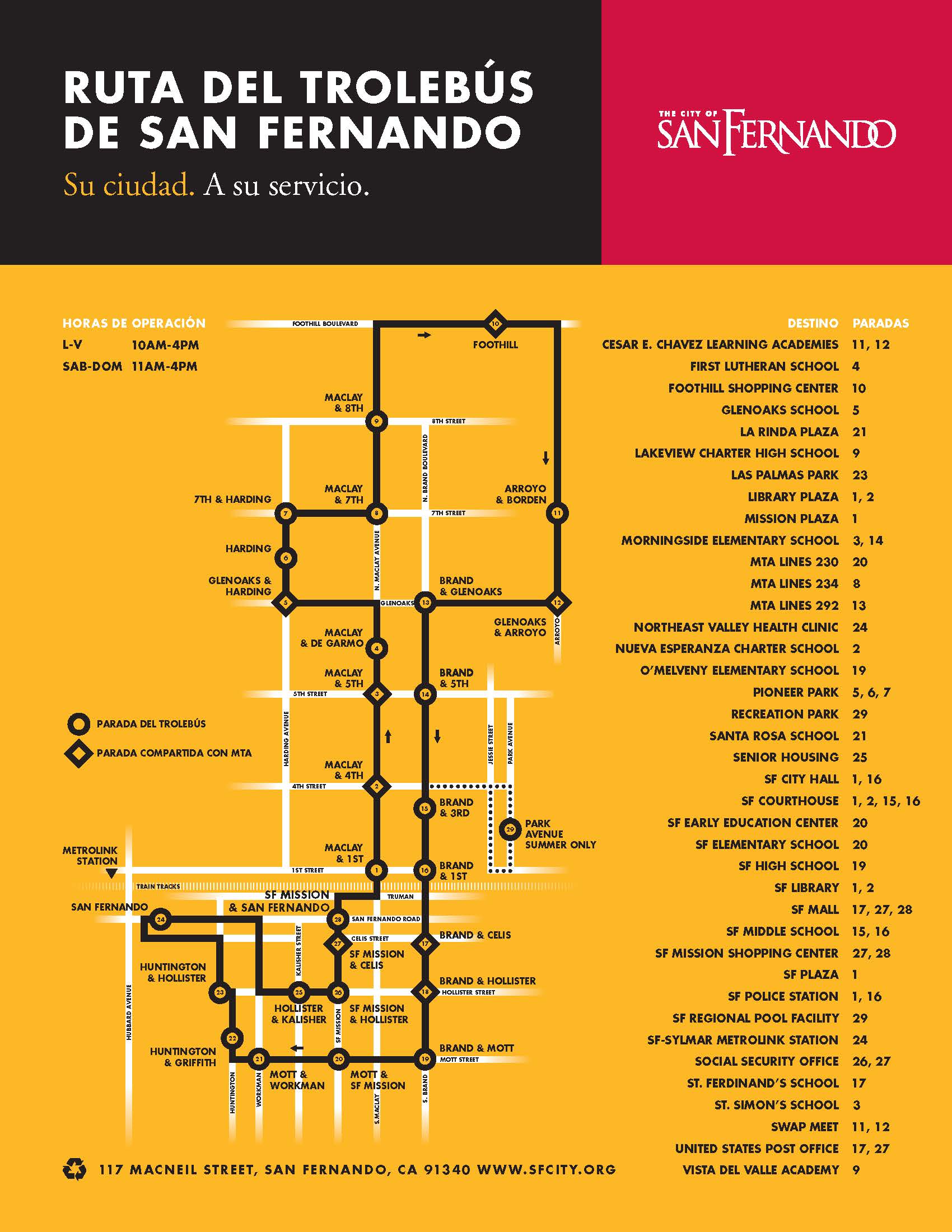 The San Fernando Trolley is a fixed-route trolley service that run daily using 28 stops to link the City's residential and commercial areas.
